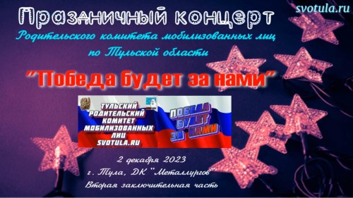 2 декабря 2023 года в ДК "Металлург" состоялся праздничный концерт "Победа будет за нами" Родительского комитета мобилизованных лиц по Тульской области. Публикуем первую часть.